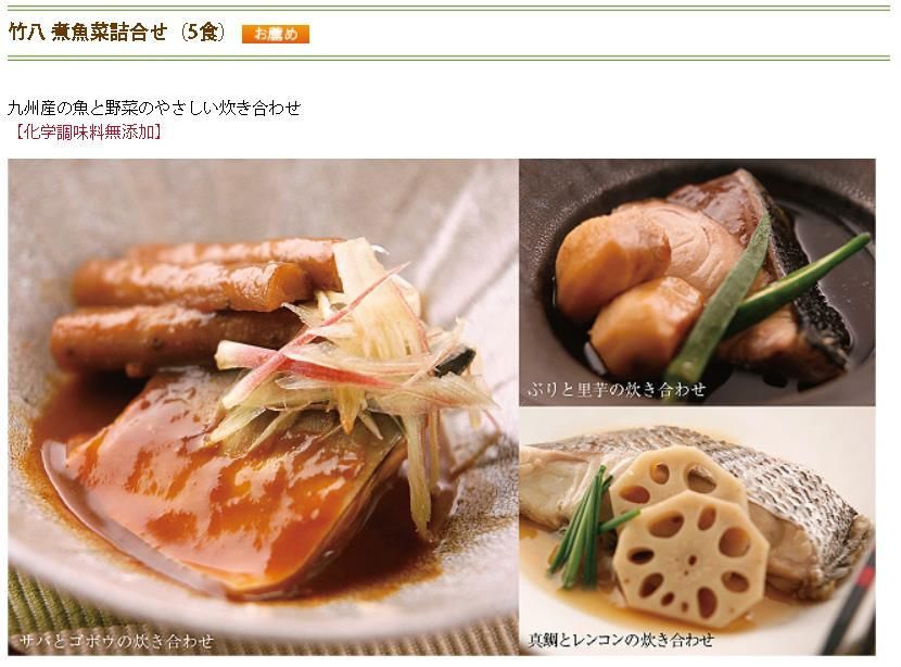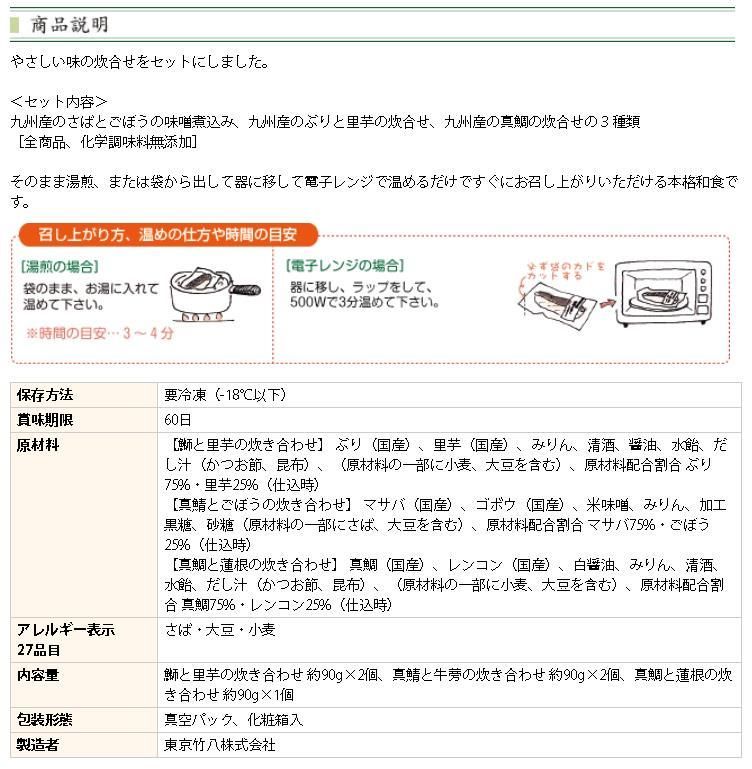 | 内容量 | 鰤と里芋の炊き合わせ 約90g×2個、真鯖と牛蒡の炊き合わせ 約90g×2個、真鯛と蓮根の炊き合わせ 約90g×1個 |