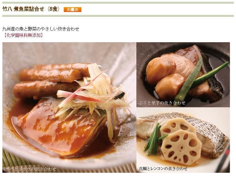 九州産のさばとごぼうの味噌煮込み、九州産のぶりと里芋の炊合せ、九州産の真鯛の炊合せの3種類[全商品、化学調味料無添加]