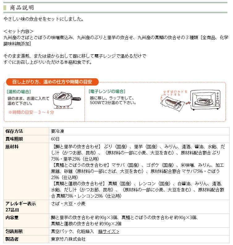 | 内容量 | 鰤と里芋の炊き合わせ 約90g×3個、真鯖とごぼうの炊き合わせ 約90g×3個、